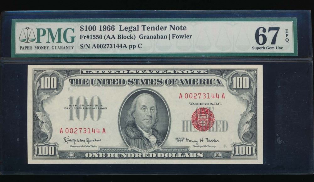 One 1966 $100 Legal Tender Note PMG 67EPQ.