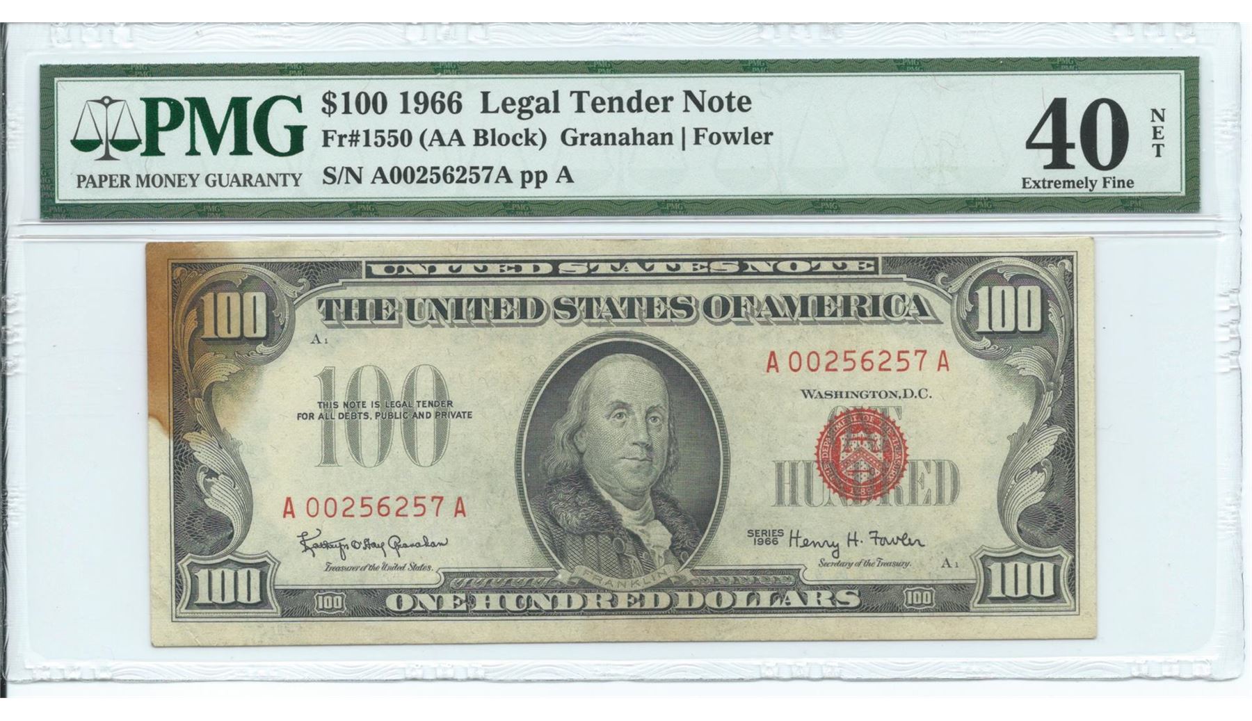 One 1966 $100 Legal Tender Note - 40 Extremely Fine