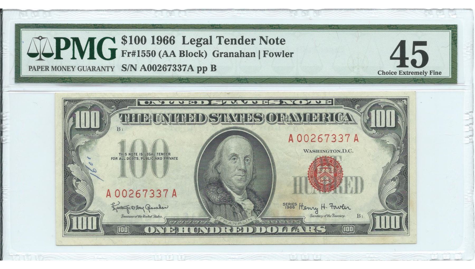 One 1966 $100 Legal Tender Note - 45 Choice Extremely Fine