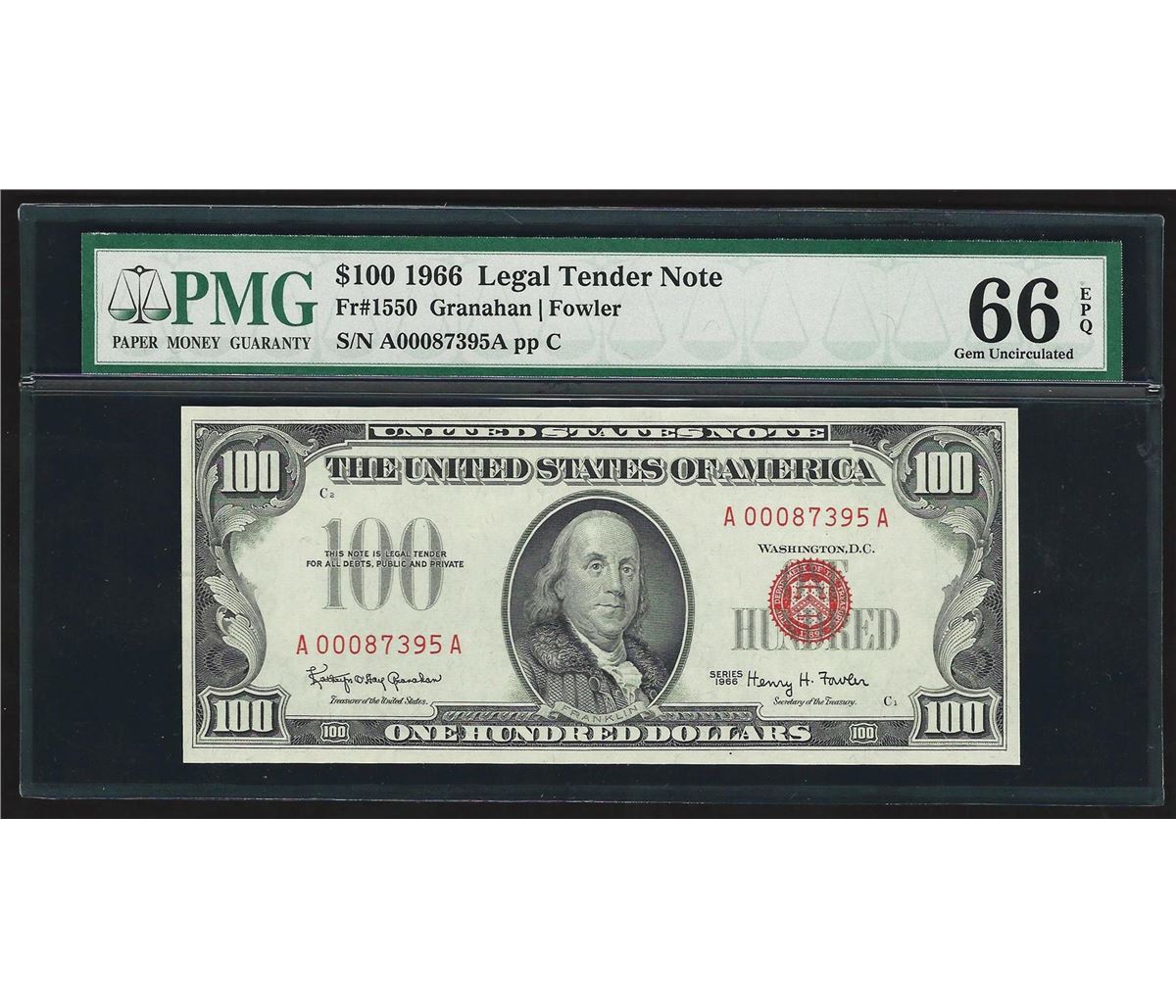 One 1966 $100 Legal Tender Note PMG Gem Uncirculated 66EPQ. PMG Certified.