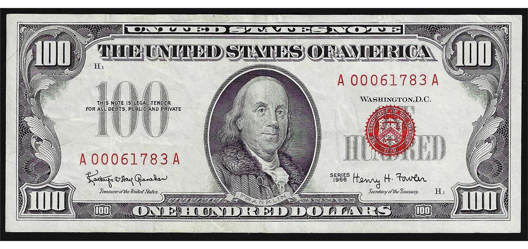 One 1966 $100 Legal Tender Note.