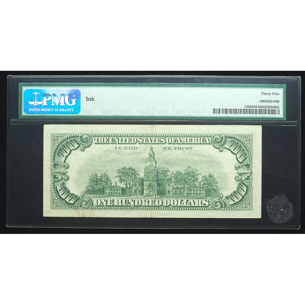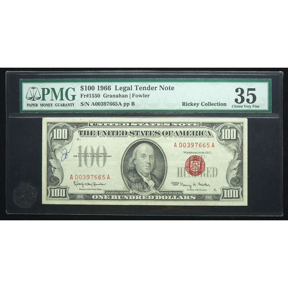 A lot of 1966 Red Seal 100 Legal Tender Notes. Grades included: VF, Ink; Fair, Edge Torn; PMG Choice VF-35, Ink. Lot of 3 notes. Estimated Value 340 - 350