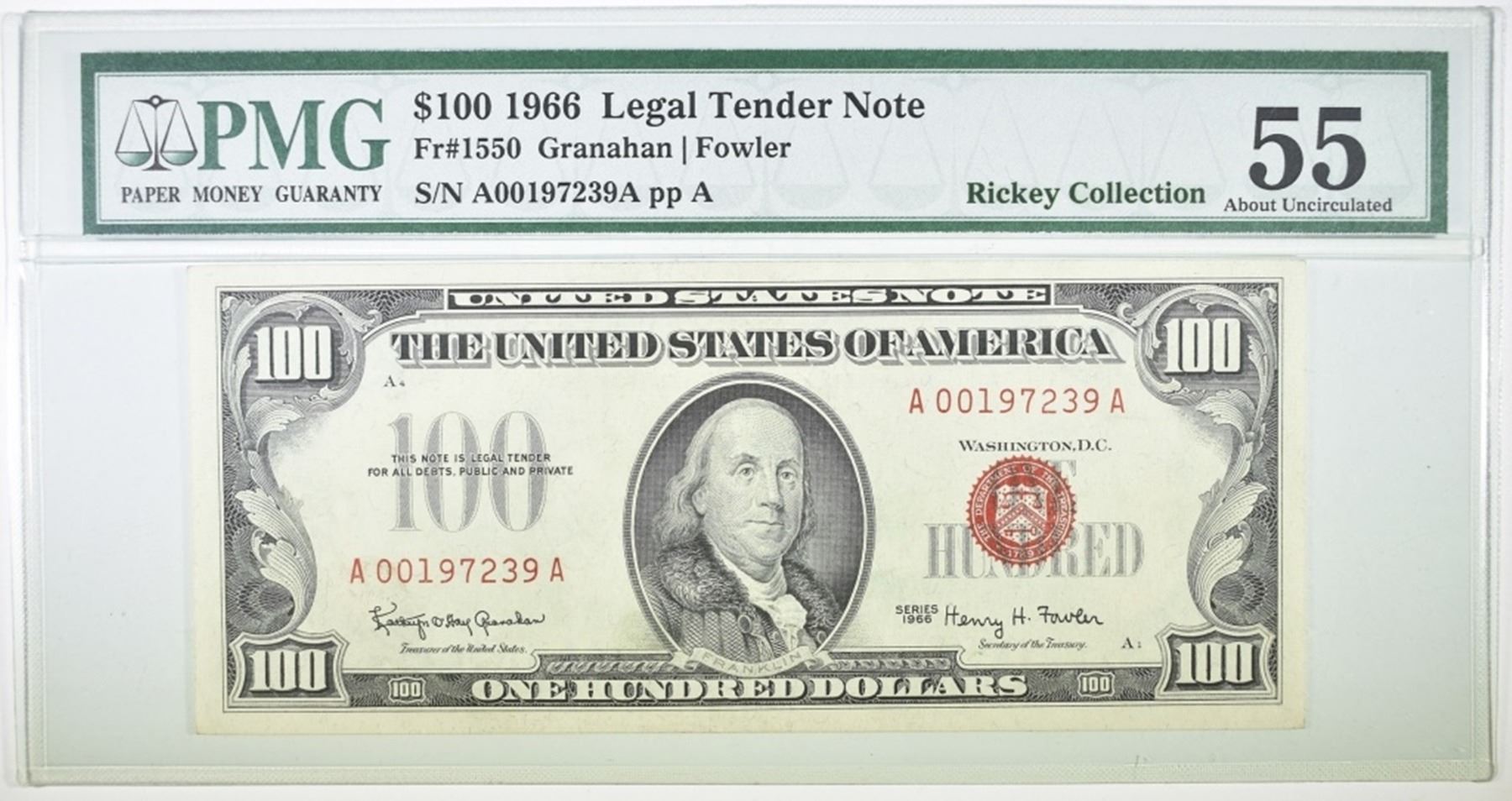 1966 $100 RED SEAL LEGAL TENDER NOTE, PMG 55