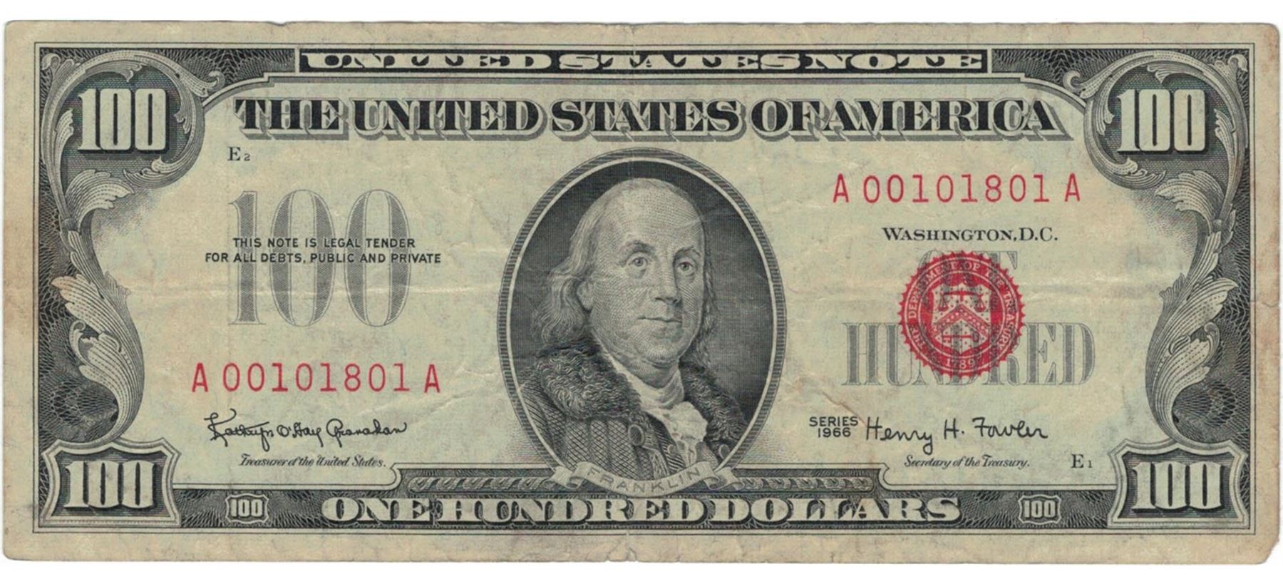 One 1966 $100 Red Seal Legal Tender Bank Note.