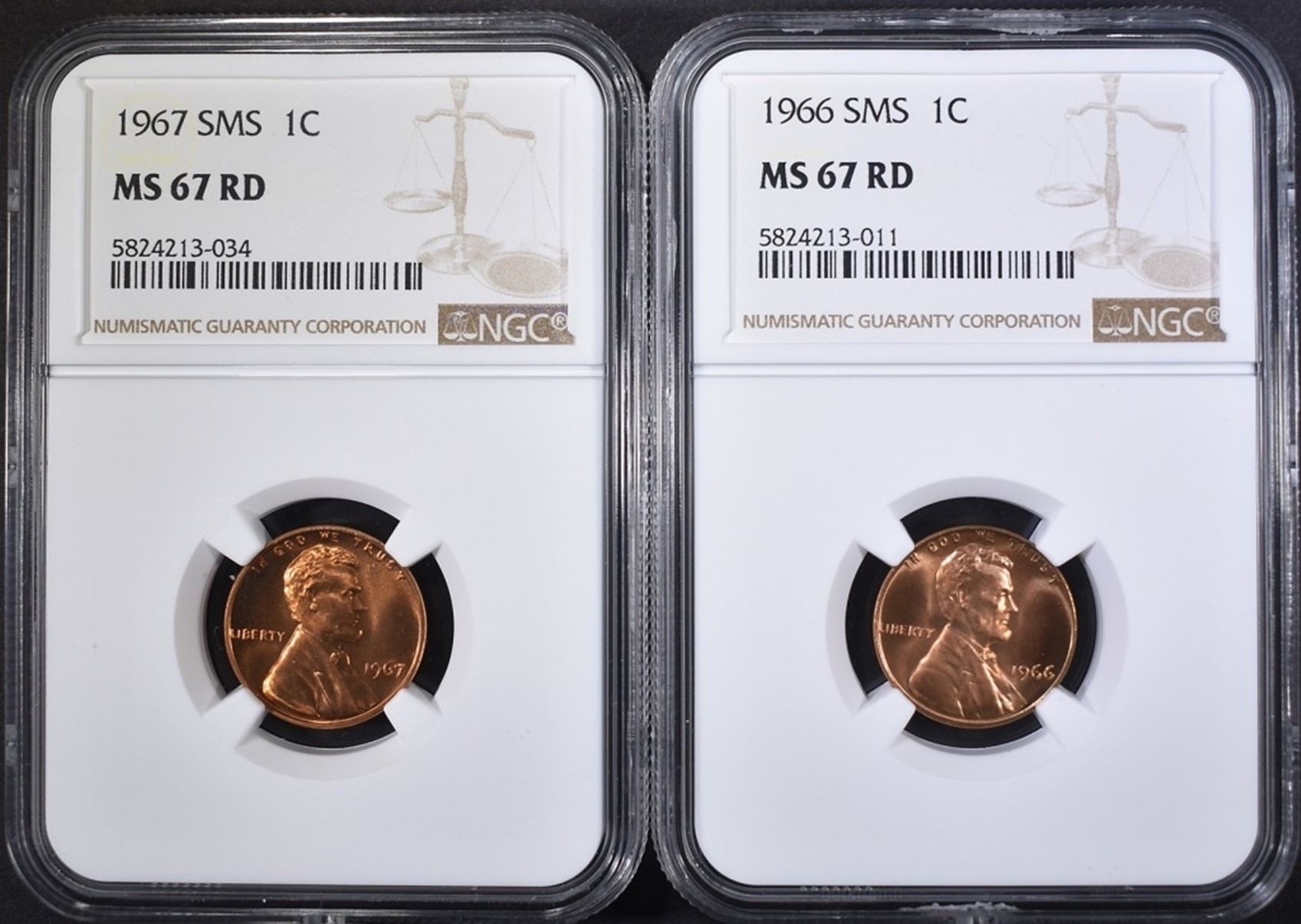 1966 & 1967 SMS LINCOLN CENTS, NGC MS-67 RD