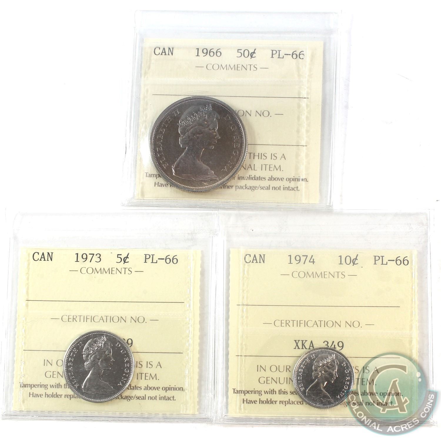 1966-1974 Canada ICCS Certified PL-66 Coin Collection. You will receive a 1966 50-cent, 1973 5-cent, and 1974 10-cent. 3pcs.