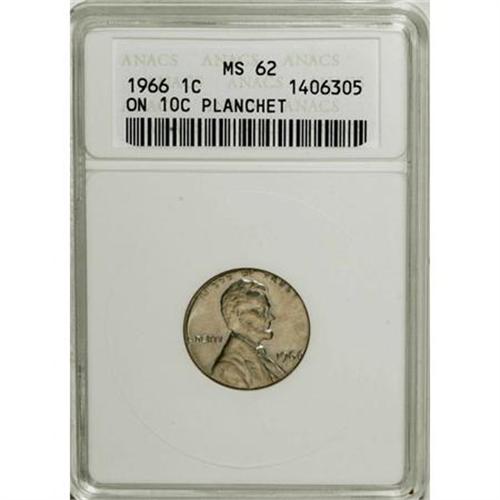 <B>1966 1C Lincoln Cent--On a Dime Planchet--MS62 ANACS.</B></I><BR><BR><B>Coin Engraver:</B> Victor D. Brenner<BR><BR><b>Shipping:</b> Coins & Currency (<a target="_blank" href="http://www.heritageauctions.com/common/shipping.php">view shipping information</a>)