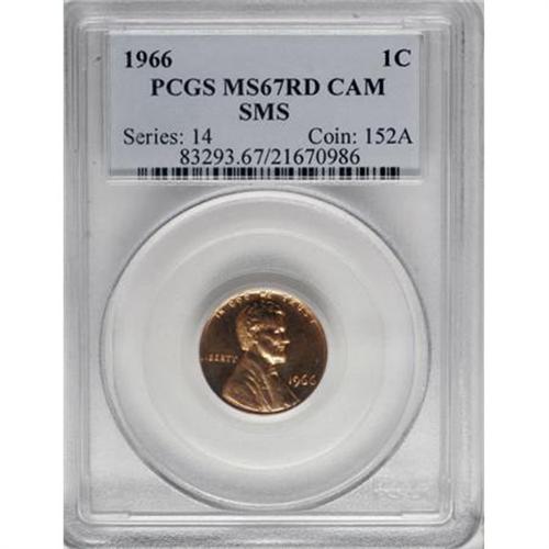 <B>1966 1C SMS MS67 Cameo PCGS.</B></I> This orange-red Superb Gem displays gorgeous Cameo contrast. The design elements are uniformly well defined, and close examination reveals no mentionable contact marks or spots. In 1965, 1966, and 1967, Special Mint Sets of higher-than-normal quality were made to substitute for proof sets. Population: 17 in 67 Cameo, 0 finer (10/07).<BR><BR><b>Shipping:</b> Coins & Currency (<a target="_blank" href="http://www.heritageauctions.com/common/shipping.php">view shipping information</a>)