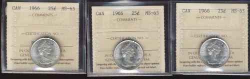 1966 25¢ ICCS MS65. Lot of three white coins.