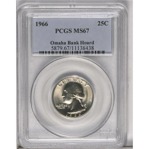 <B>1966<25C> MS67 PCGS.</B></I> Ex: Omaha Bank Hoard. This essentially immaculate Superb Gem has a hint of apricot patina. The orange peel texture is caused by long-in-use dies. The mints threw out all stops by 1966 to replace hoarded silver coins with clad replacements. Population: 37 in 67, 0 finer (5/06).