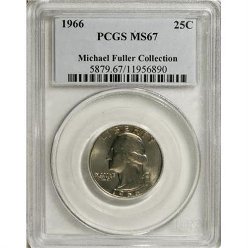<B>1966 25C MS67 PCGS.</B></I> Ex:Michael Fuller Collection. PCGS Population (39/0). NGC Census: (10/0). Mintage: 821,101,504. Numismedia Wsl. Price for NGC/PCGS coin in MS67: $300. (#5879)<BR><BR><B>Coin Engraver:</B> John Flanagan<BR><BR><b>Shipping:</b> Coins & Currency (<a target="_blank" href="http://www.heritageauctions.com/common/shipping.php">view shipping information</a>)