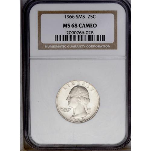 <B>1966 25C SMS MS68 Cameo NGC.</B></I> For three years from 1965 through 1967, the Mint did not issue Proof Sets or Mint Sets. Instead, they produced "Special Mint Sets" that were essentially a hybrid issue. When they were issued, these coins were far finer than the usual business strike coinage placed in Mint Sets, but they were not up to the normal proof standard. This example is an exceptional coin with lovely gray surfaces, deeply reflective fields, and frosty devices. Census: 18 in 68, 0 finer (1/06).