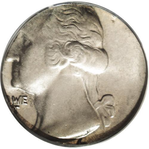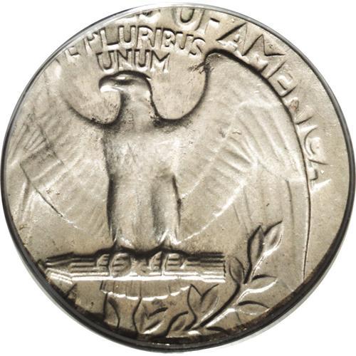 <B>1966<25C> Washington Quarter--Struck on a Clad Dime Planchet--MS65 PCGS.</B></I> Though only part of the last digit appears on the planchet, a combination of the reverse design and lack of detail in the obverse hair pins down the date. Baby blue and pale gold patina appears on both sides, which display the expected weakness. Practically all of the eagle's right (facing) wing and Washington's nose are visible.
