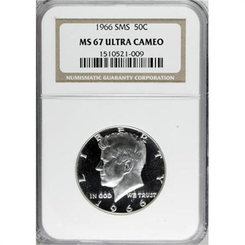 <B>1966 50C SMS MS67 Deep Cameo NGC.</B></I> NGC Census: (19/6). PCGS Population (19/4). Numismedia Wsl. Price for NGC/PCGS coin in MS67: $850. (#96846)<BR><BR><b>Shipping:</b> Coins & Currency (<a target="_blank" href="http://www.heritageauctions.com/common/shipping.php">view shipping information</a>)