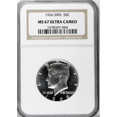 <B>1966 50C SMS MS67 Deep Cameo NGC.</B></I> NGC Census: (21/6). PCGS Population (20/4). Numismedia Wsl. Price for NGC/PCGS coin in MS67: $850. (#96846)<BR><BR><b>Shipping:</b> Coins & Currency (<a target="_blank" href="http://www.heritageauctions.com/common/shipping.php">view shipping information</a>)