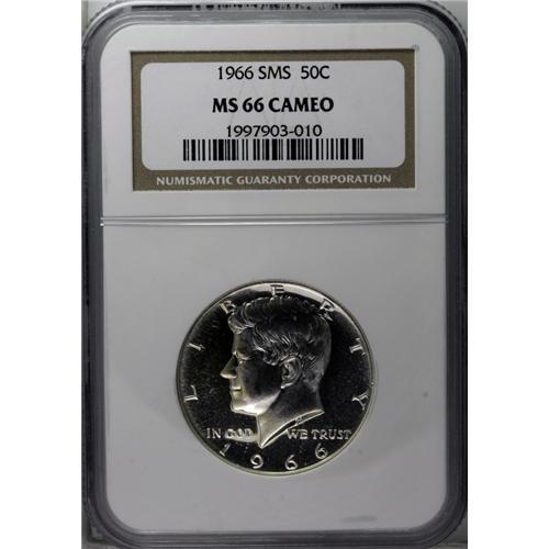 <B>1966<50C> SMS MS66 Cameo NGC.</B></I> A touch of lemon-yellow appears in the centers of this moderately contrasting example. Nicely struck and appealing with strong luster.