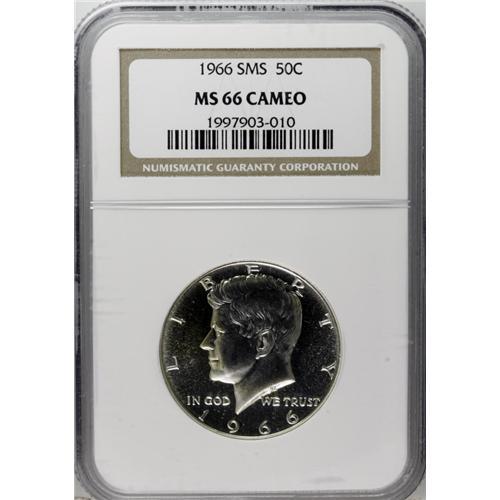 <B>1966 50C SMS MS66 Cameo NGC.</B></I> A touch of lemon-yellow appears in the centers of this moderately contrasting example, suitably struck and appealing with strong luster. A handful of tiny ticks are present in the fields.<BR><BR><b>Shipping:</b> Coin/Currency (<a target="_blank" href="http://www.heritageauctions.com/common/shipping.php">view shipping information</a>)