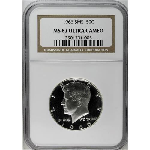 <B>1966<50C> SMS MS67 Ultra Cameo NGC.</B></I> This spectacular Special Mint Set piece has snow-white devices and darkly mirrored fields. Essentially perfect save for a hint of strike incompleteness on the base of the shield.