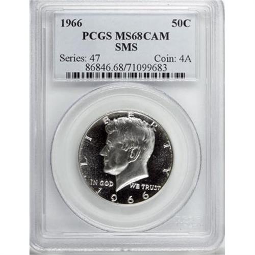 <B>1966 50C SMS MS68 Cameo PCGS.</B></I> Carefully preserved and gleaming with distinct contrast. The essentially untoned and watery fields offer excellent reflectivity. PCGS has graded no finer Cameo examples (10/07).<BR><BR><b>Shipping:</b> Coins & Currency (<a target="_blank" href="http://www.heritageauctions.com/common/shipping.php">view shipping information</a>)