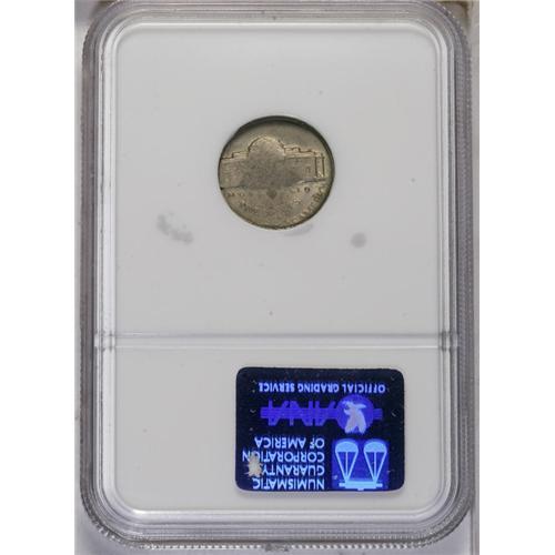 <B>1966<5C> Jefferson Nickel--Struck on a Dime Planchet--MS62 NGC.</B></I> The dime planchet, being much thinner than a nickel planchet, has some unstruck areas in the center of each side, and the coin is shifted left, so that the right-side peripheral legends are clearest, including the date and LIBERTY on the obverse, and portions of the legends below Monticello.