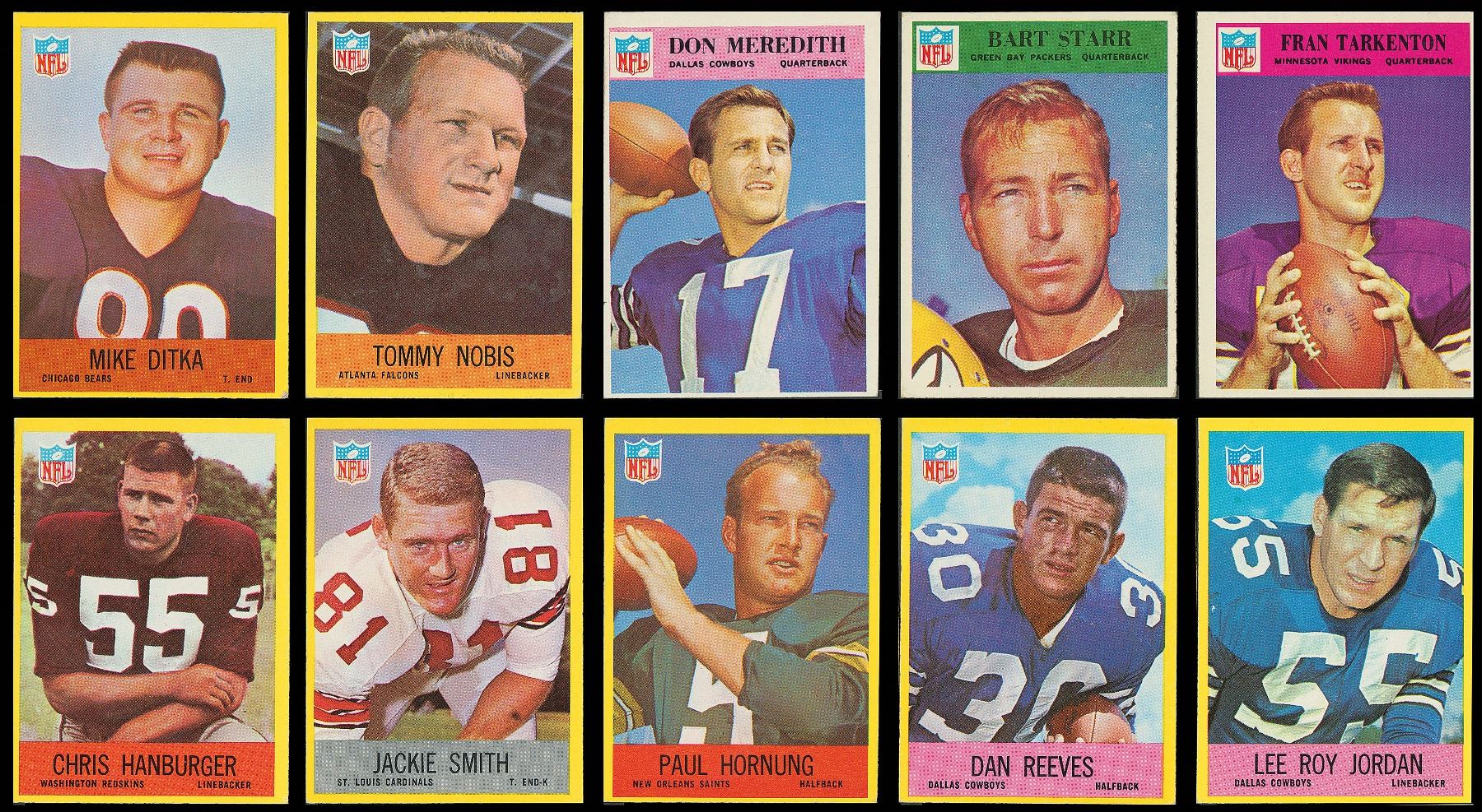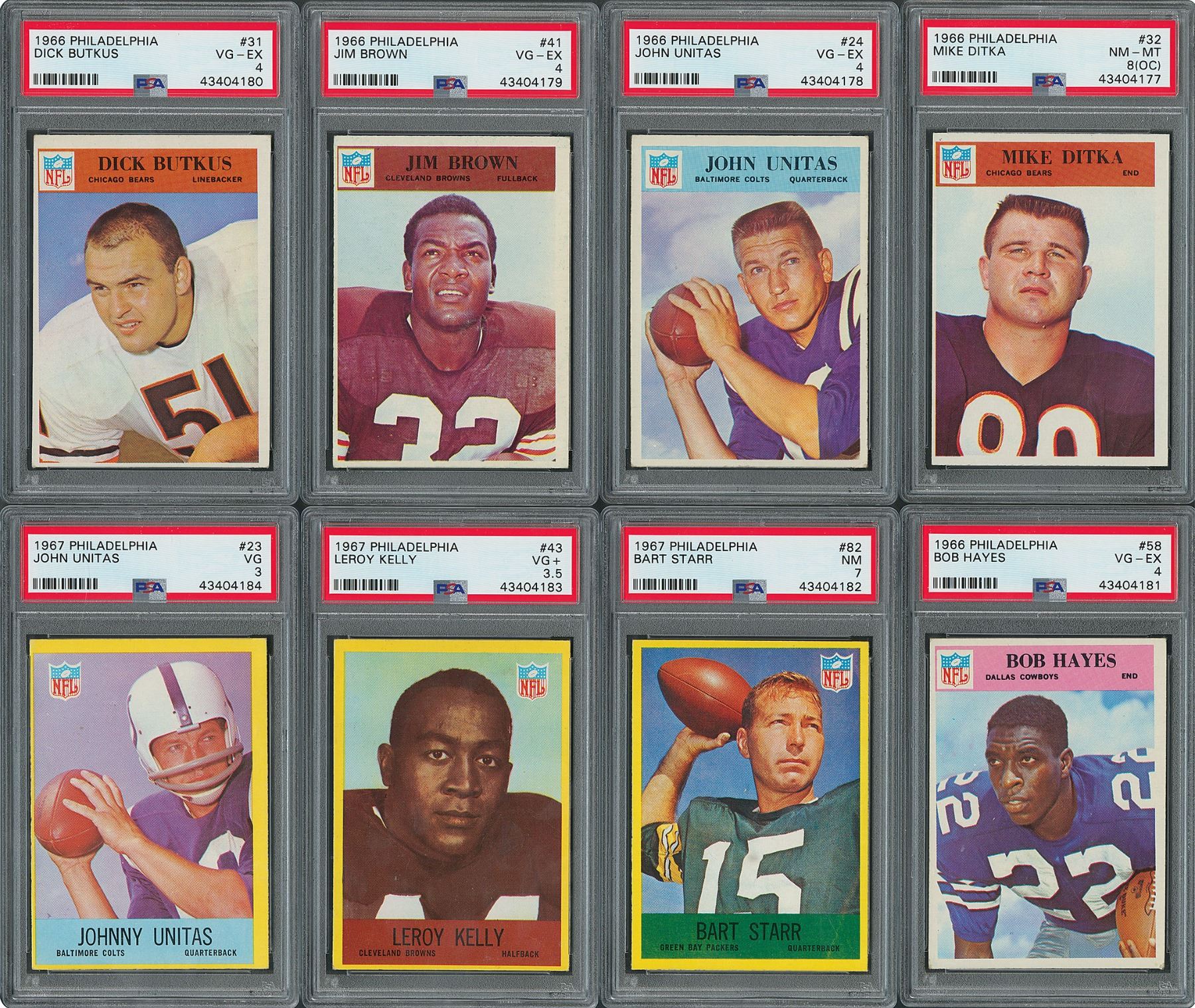 Includes: 1966 Philadelphia - partial set (186/198) cards with #15 Berry (VG/EX), 24 Unitas (PSA VG-EX 4), 31 Butkus RC (PSA VG-EX 4), 32 Ditka (PSA NM-MT 8 OC), 41 Brown (PSA VG-EX 4), 58 Hayes RC (PSA VG-EX 4), 61 Meredith (VG/EX), 87 Nitschke (FR, back writing), 88 Starr (GD), 114 Tarkenton (VG/EX), 165 Smith RC (EX), 85 Jurgensen (VG/EX), and 197 CL (VG/EX).