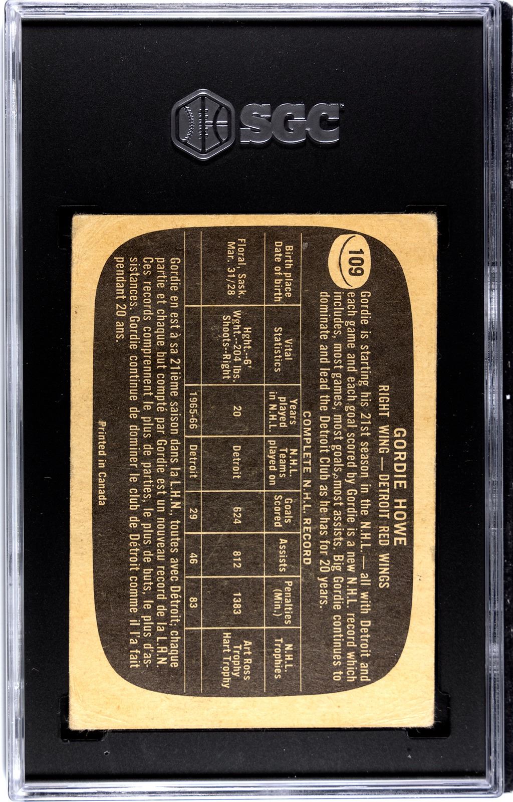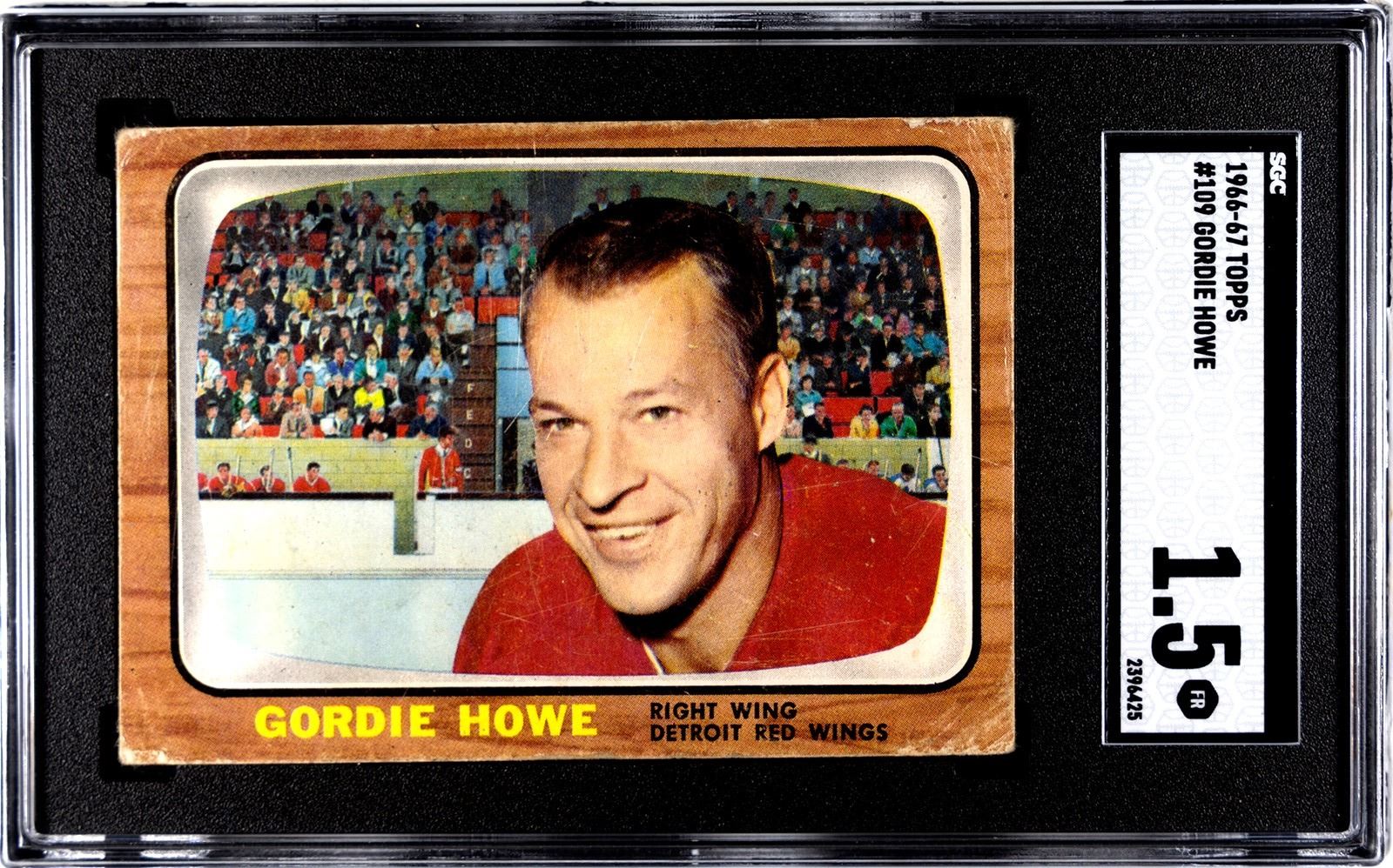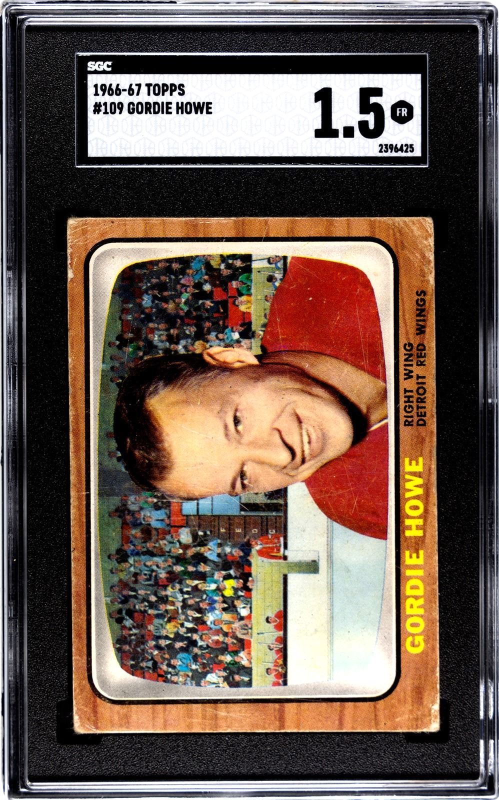 Off-grade example of Mr. Hockey's popular 66 Topps card. Graded 1.5 FR by SGC.