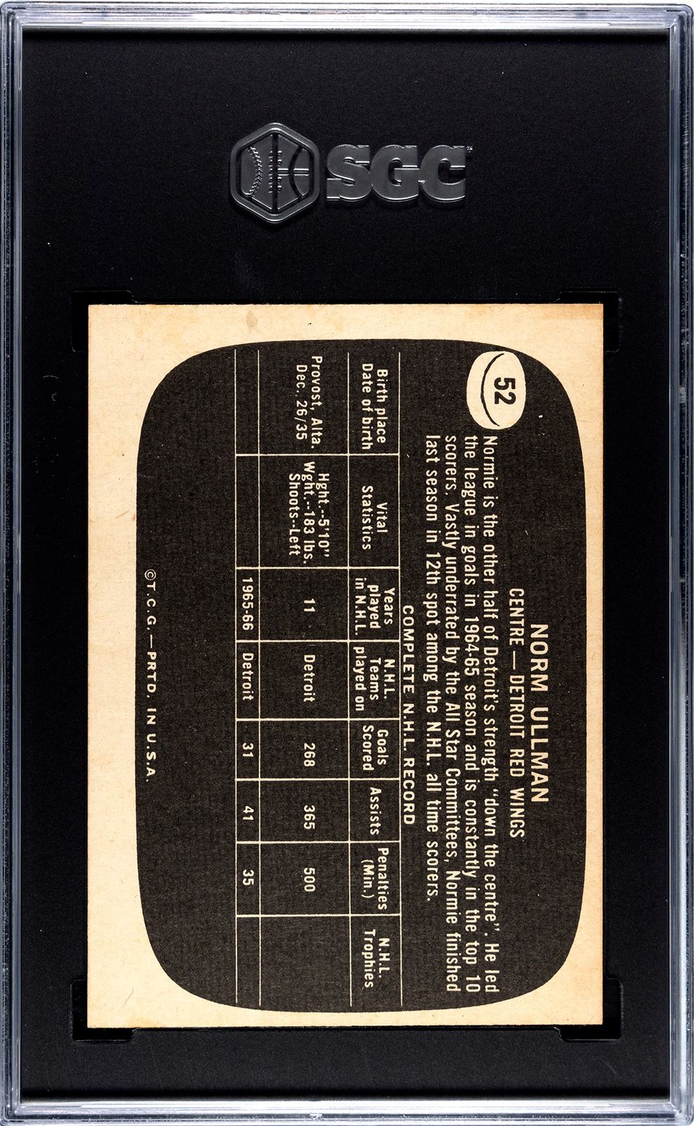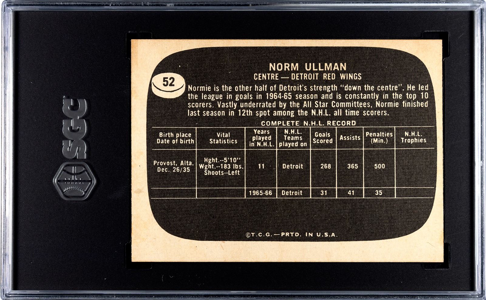 Another rarity, this one featuring HOFer Norm Ullman. SGC has graded only 9 of these, with this one being 1 of 2 in this grade, with only 2 graded higher. Graded a sharp 6 EX-NM by SGC!