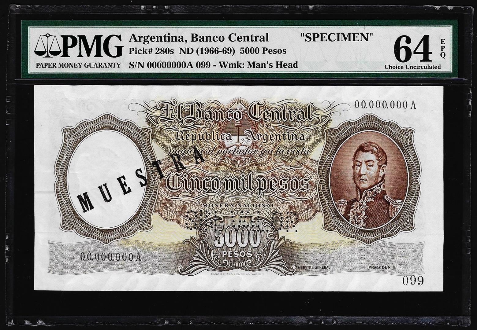 One 1966-69 Argentina 5000 Pesos Banco Cental Specimen Note PMG Choice Uncirculated 64EPQ. PMG Certified.