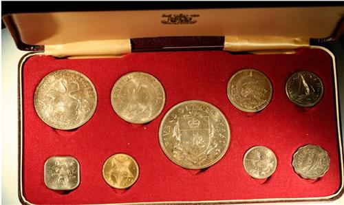 Original 9 piece commemorative set issued by the Royal Mint in London. Displayed in a maroon leather plush case with gold lettering. Contains one each silver $5, $2, $1, Fifty cent along with the nickel 25 cent, copper-nickel 15, 10, 5 cent and nickel-brass cent.