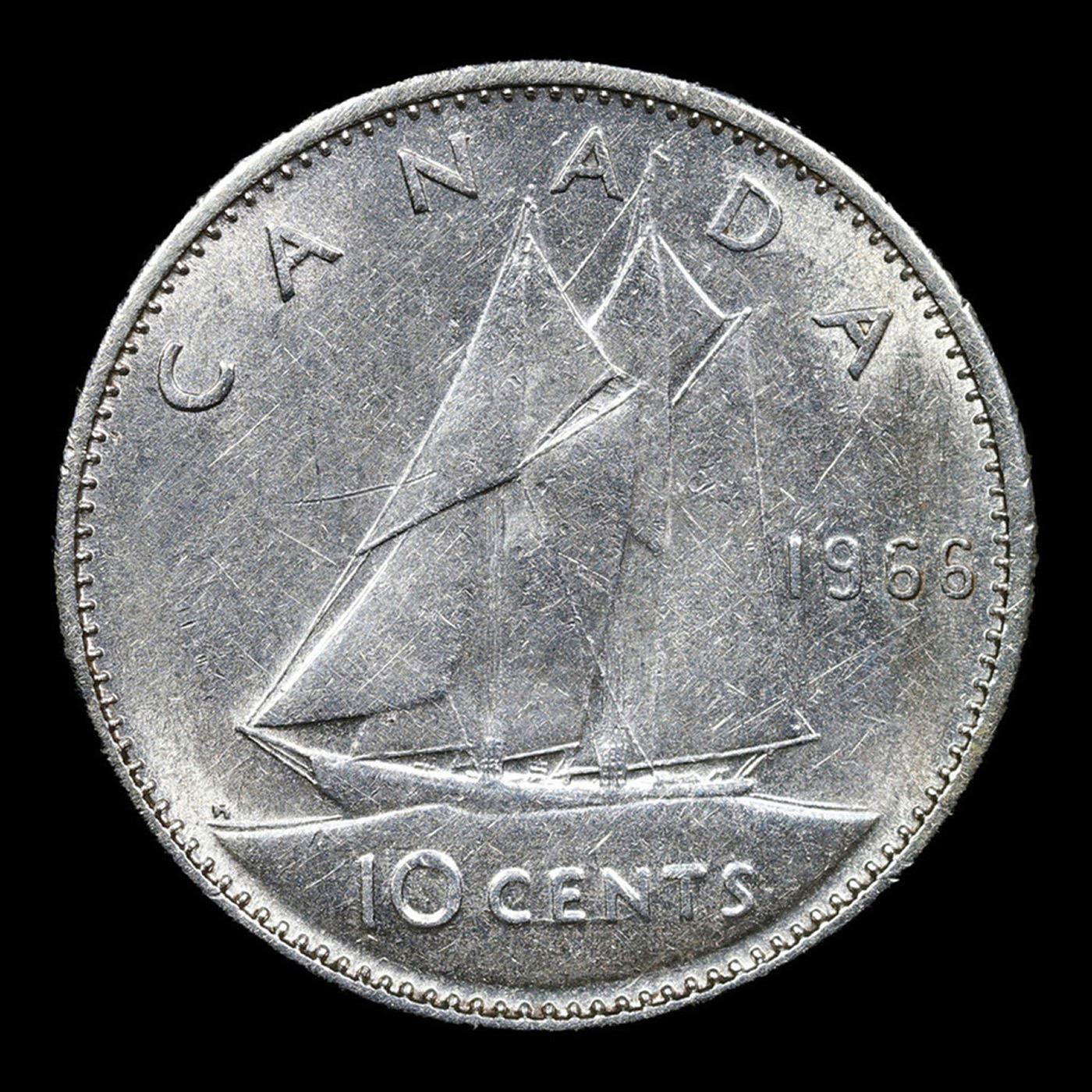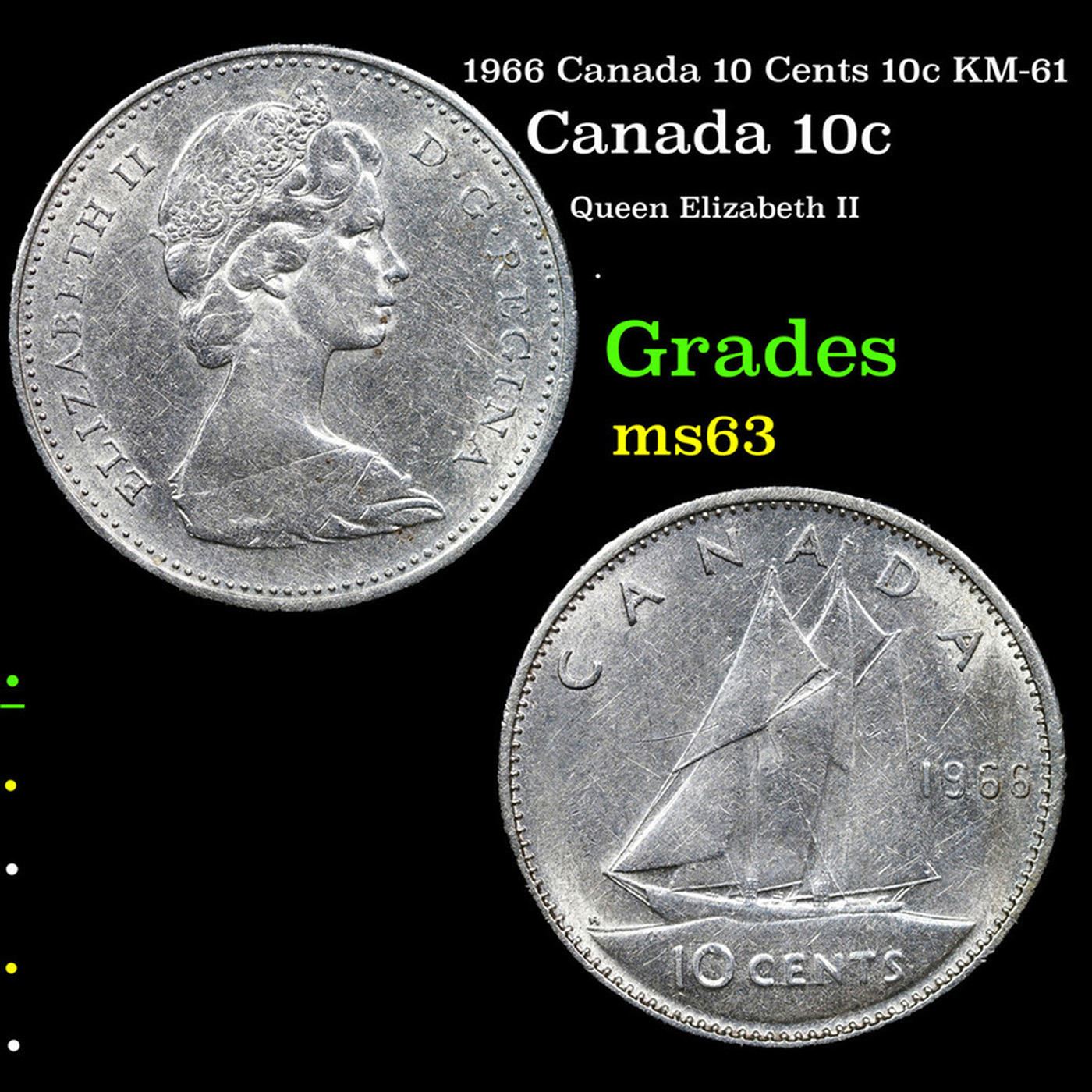 1966 Canada 10 Cents 10c KM-61 Grades Select Unc. Elizabeth was born in Mayfair, London, as the first child of the Duke and Duchess of York (later King George VI and Queen Elizabeth). Her father acceded to the throne in 1936 upon the abdication of his brother, King Edward VIII, making Elizabeth the heir presumptive. She was educated privately at home and began to undertake public duties during the Second World War, serving in the Auxiliary Territorial Service. In November 1947, she married Philip Mountbatten, a former prince of Greece and Denmark, and their marriage lasted 73 years until Philip's death in 2021. They had four children: Charles, Prince of Wales; Anne, Princess Royal; Prince Andrew, Duke of York; and Prince Edward, Earl of Wessex.When her father died in February 1952, Elizabeth—then 25 years old—became queen regnant of seven independent Commonwealth countries: the United Kingdom, Canada, Australia, New Zealand, South Africa, Pakistan, and Ceylon, as well as Head of the Commonwealth. Elizabeth has reigned as a constitutional monarch through major political changes such as the Troubles in Northern Ireland, devolution in the United Kingdom, the decolonisation of Africa, and the United Kingdom's accession to the European Communities and withdrawal from the European Union. The number of her realms has varied over time as territories have gained independence, and as some realms have become republics. Her many historic visits and meetings include state visits to the People's Republic of China in 1986, the Russian Federation in 1994, the Republic of Ireland in 2011, and visits to or from five popes.Significant events have included Elizabeth's coronation in 1953 and the celebrations of her Silver, Golden, Diamond and Platinum jubilees in 1977, 2002, 2012, and 2022, respectively. Elizabeth is the longest-lived and longest-reigning British monarch, the oldest and longest-serving incumbent head of state, and the second-longest reigning sovereign monarch in world history. She has faced occasional republican sentiment and press criticism of the royal family, particularly after the breakdown of her children's marriages, her annus horribilis in 1992, and the death in 1997 of her former daughter-in-law Diana, Princess of Wales. However, support for the monarchy in the United Kingdom has been and remains high, as does her personal popularity.