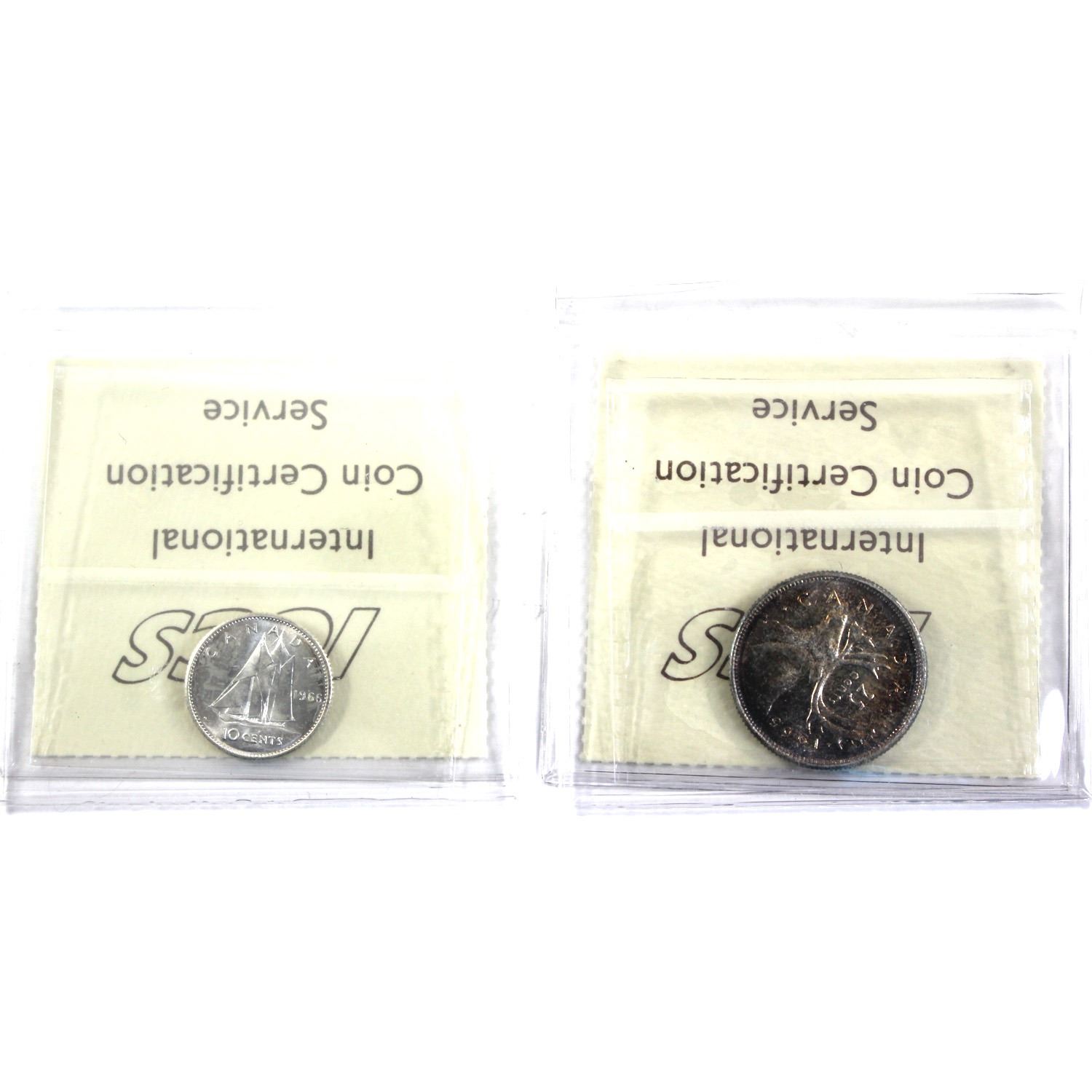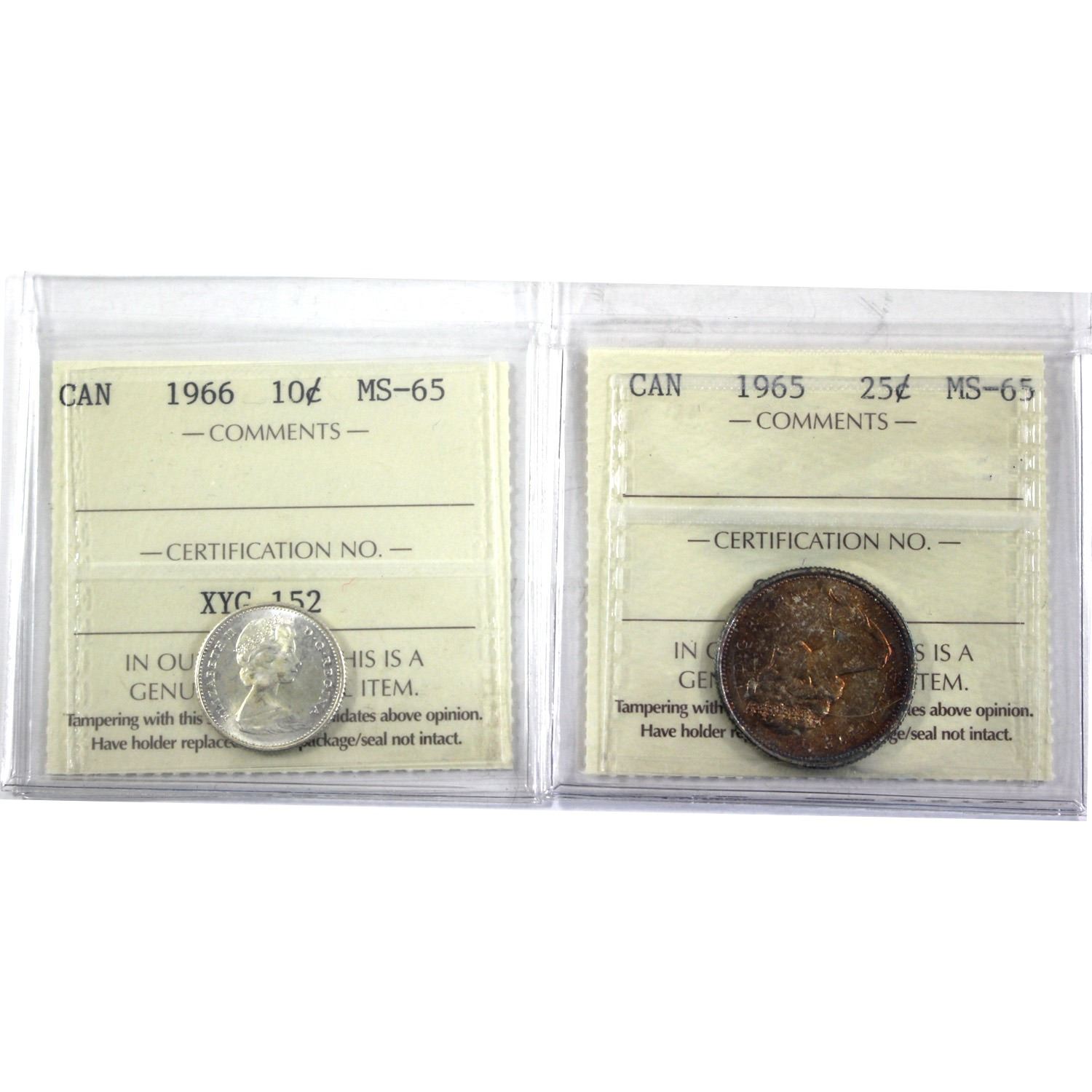 1966 Canada 10-cent & 1965 25-cent ICCS Certified MS-65. 2pcs