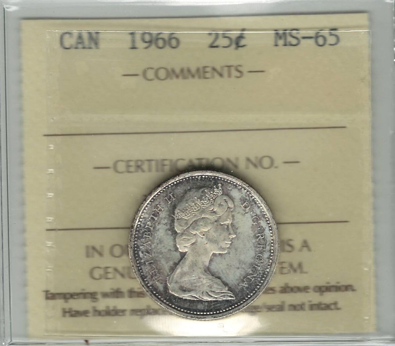 1966 Canada 25 Cent ICCS MS 65
