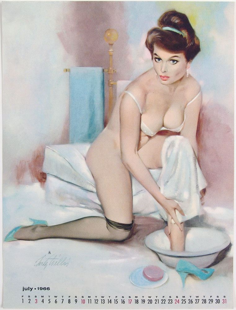 This is a vintage July, 1966 page from a Brown & Bigelow calendar featuring a risque pin-up print by Fritz Willis. SIZE: Approx. 9" x 12".