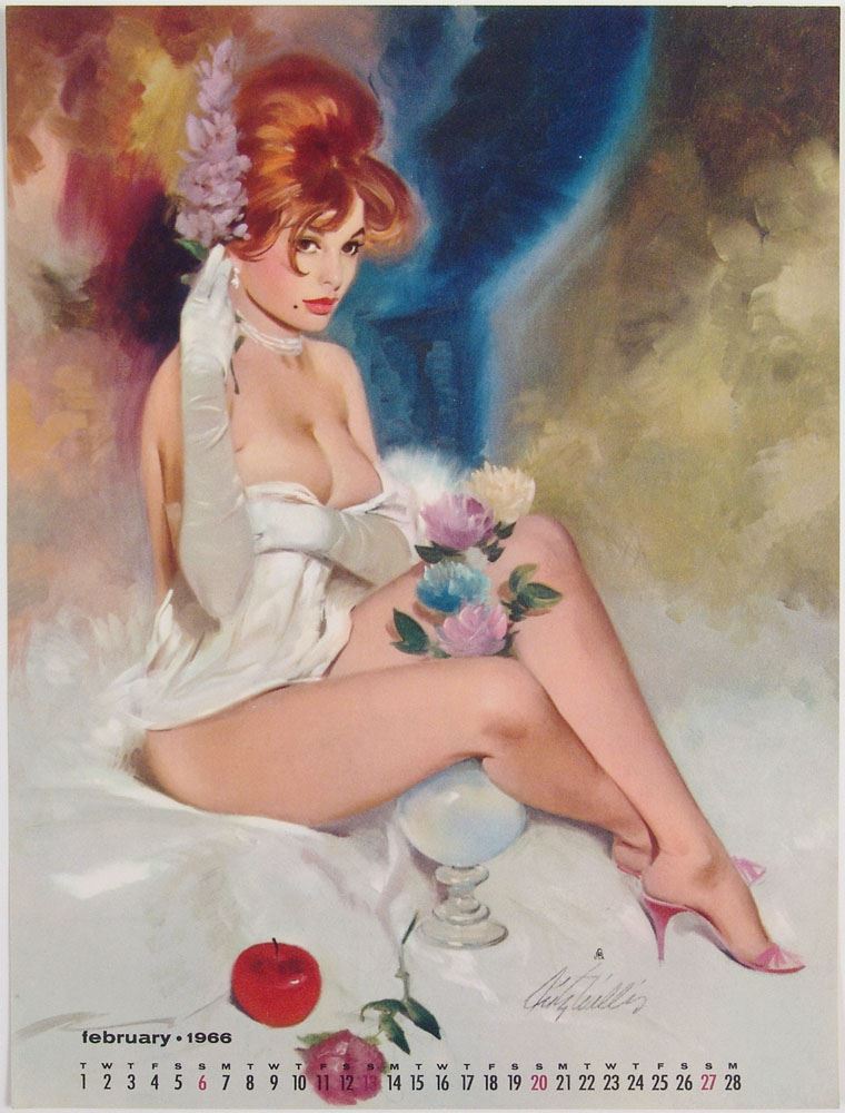 This is a vintage February, 1966 page from a Brown & Bigelow calendar featuring a risque pin-up print by Fritz Willis. SIZE: Approx. 9" x 12".