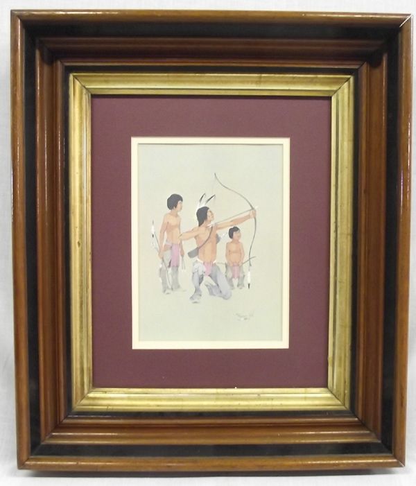 1966 Framed & matted Print by artist Jerome Tiger. From the collection of Nick and Suzanne Nicholas. Vivid in color with a sealed paper back. Jerome Tiger, a full blooded Creek-Seminole Indian from Oklahoma, had no formal training. His subjects were based on his own rich dramatic heritage. This Print has an approx. visual measurement of 8''H x 6''W.
