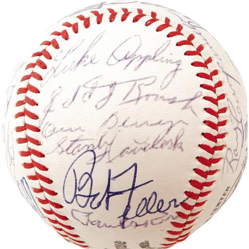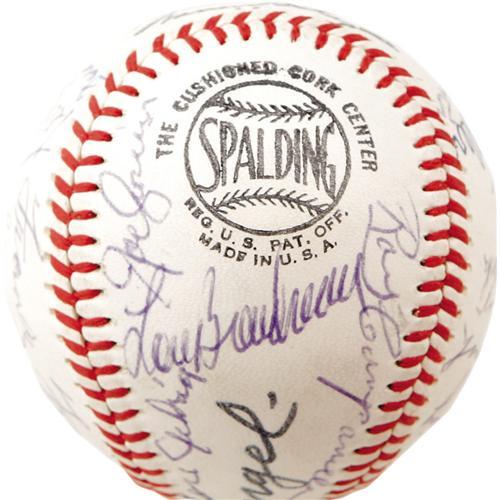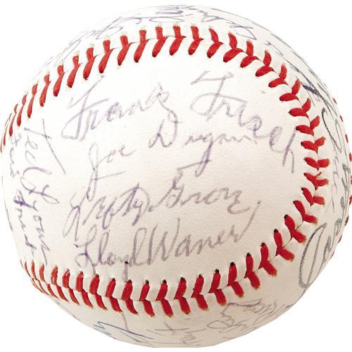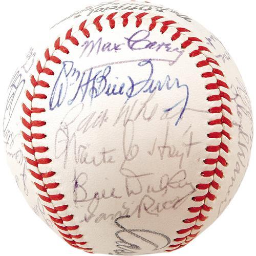 <B>1966 Hall of Famers Multi-Signed Baseball.</B></I> The ageless baseball guru Casey Stengel is appropriately afforded the sweet spot of this ONL (Giles) ball, almost certainly signed at the 1966 Cooperstown induction ceremonies where the Ol' Perfesser got his rightful due. Joining him is a magnificent menagerie of top baseball talent, namely Cronin, Boudreau, Rice, Dickey, Hoyt, Wheat, Terry, Carey, Appling, Roush, Coveleski, Feller, Frick, Lyons, Frisch, Grove and Lloyd Waner. That's eighteen Hall of Fame signatures, not counting those penned by the wives of Lou Gehrig and Roy Campanella. Twenty-three autographs are here in all, not a single one dipping below 9/10 in boldness. The ball itself is splendidly white, and presents perfectly. Hard to believe that so many diamond legends could fit on a single horsehide sphere. <I>LOA from PSA/DNA.</B></I>