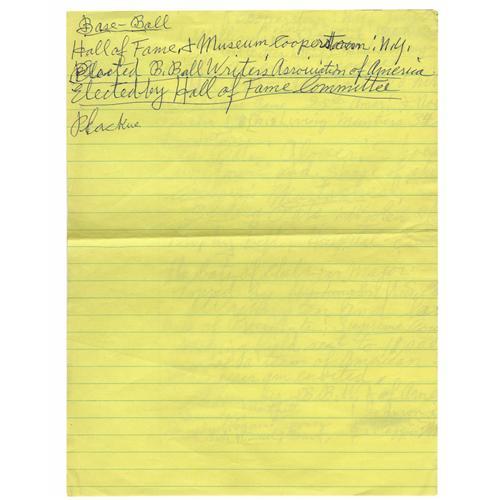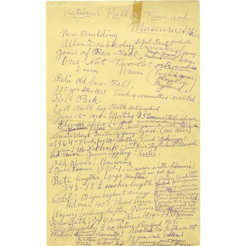 <B>1966 Handwritten Notes for Casey Stengel's Hall of Fame Induction Speech from the Casey Stengel Collection.</B></I> Titanically important offering is believed to represent the first time a Hall of Famer's induction speech notes have ever been offered for public sale. Unceremoniously "filed" in a tremendous stack of Stengel's paperwork, these three pages were spotted by a sharp Heritage staffer who recognized them for what they are. An 8.5x11" lined yellow page begins with the words, "Hall of Fame & Museum, Cooperstown, N.Y., July 25th 1966," and goes on to mention a fellow inductee "Ted Williams, perfect swing, can hit distance, greatest batter hitting L. handed in my experience in the American League." He discusses "old bats, gloves, shoes, uniforms and shape of shirts with collars, mustaches, sliding pads, woolen shirts...This year am enducted (sic), Chosen by B.B.W.A. of America." A second yellow page seems to be a false start, but begins much like the first. Another page approximately the size of a legal pad continues with notes like "New Building, Abner Doubleday, game of Base-Ball, One-Cat Two-Cat or Rounders." Later he lists the names of all original inductees, "Wagner, Grover Alexander...," noting "one alive." Far too much terrific content to include here, but whether these pages were on the podium with Casey when he accepted the greatest honor in baseball, or were just early drafts, the tremendous importance and value of these pages cannot be denied. All ink is in 10/10 condition, and pages are oddly folded but show no noteworthy damage.