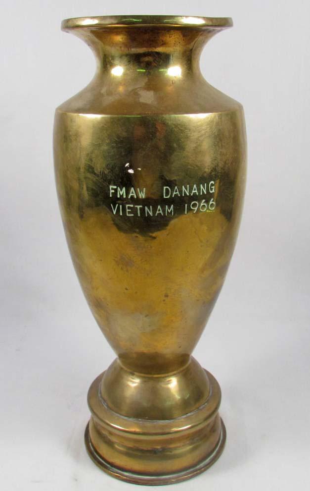 1966 LARGE BRASS TRENCH ART TROPHY FROM VIETNAM WAR - Trophy is made from 1944 105mm Artillery Casing. Inscription reads FMAW Danang Vietnam 1966. Approx. 13" tall