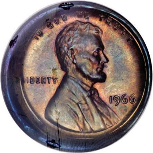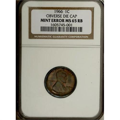<B>1966 Lincoln Cent--Obverse Die Cap--MS65 Red and Brown NGC.</B></I> This type of cent error is most often observed on coins struck during the 1990s. Capped die errors on Lincoln cents minted in the 1960s are far more difficult to locate. The current piece is a picture-perfect example of an obverse die cap error. The edge is drawn up to approximately three times the original thickness of the cent, and is relatively uniform in depth. The obverse is Red and Brown, as stated on the NGC holder, but the reverse and part of the obverse rim is a psychedelic array of electric-blue, orange and magenta iridescence.<BR><BR><B>Coin Engraver:</B> Victor D. Brenner<BR><BR><b>Shipping:</b> Coins & Currency (<a target="_blank" href="http://www.heritageauctions.com/common/shipping.php">view shipping information</a>)