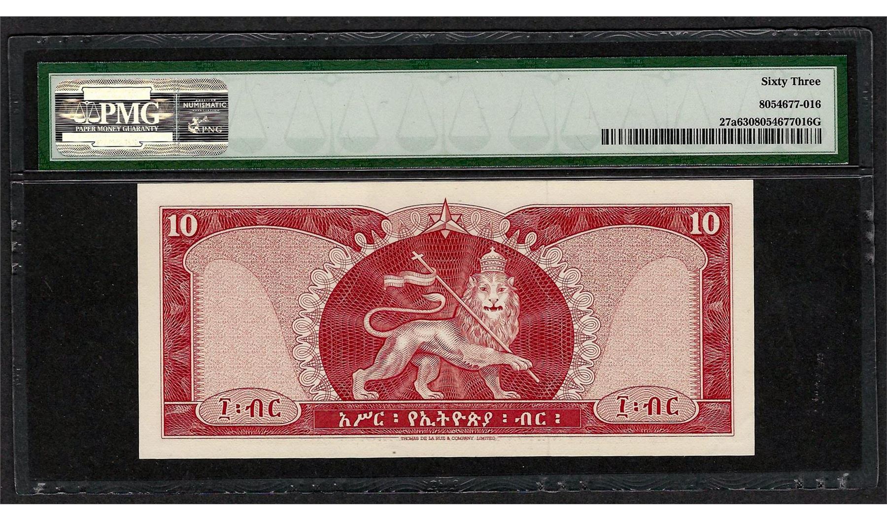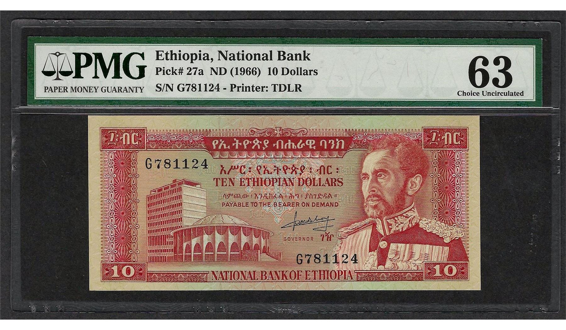 One 1966 National Bank Ethiopia 10 Dollars Note Pick# 27a PMG Chouce Uncirculated 63. PMG Certified.