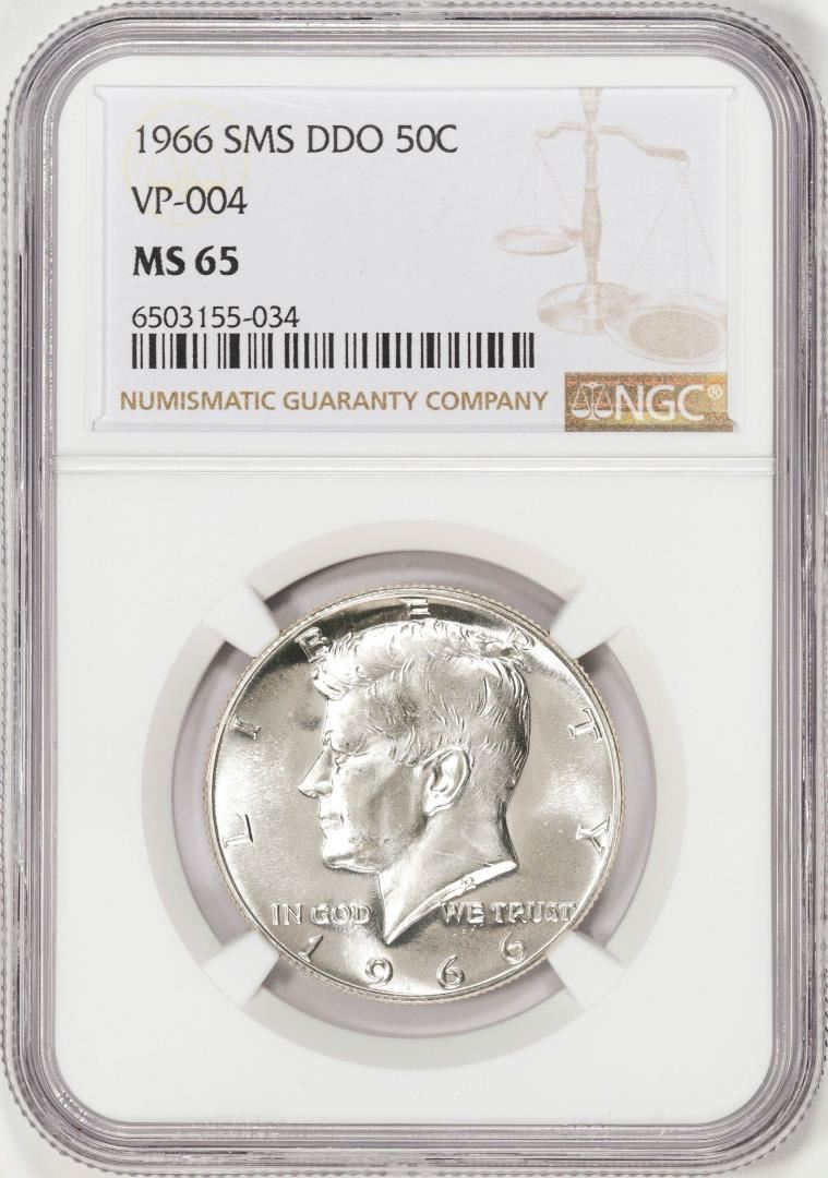 One 1966 SMS Doubled Die Obverse VP-004 Kennedy Half Dollar Coin NGC MS65. NGC Certified.