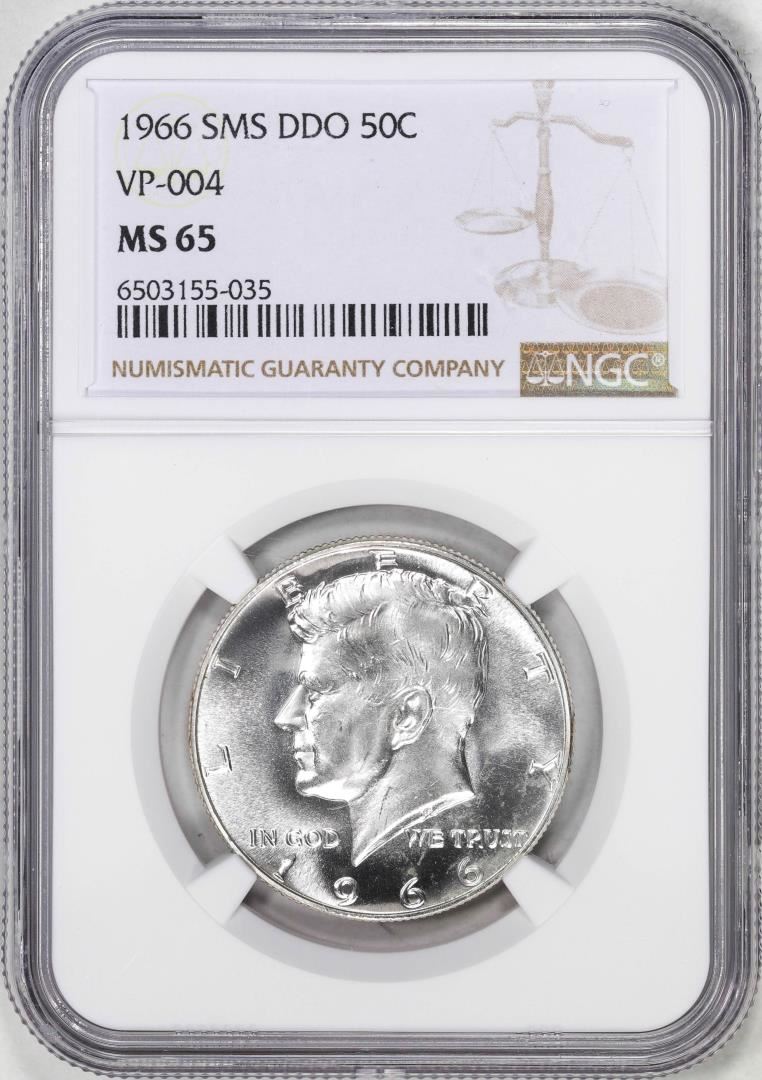 One 1966 SMS Kennedy Half Dollar Coin Double Die Obverse VP-004 NGC MS65. NGC Certified.