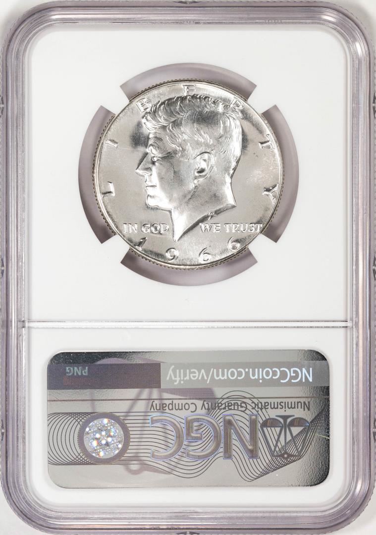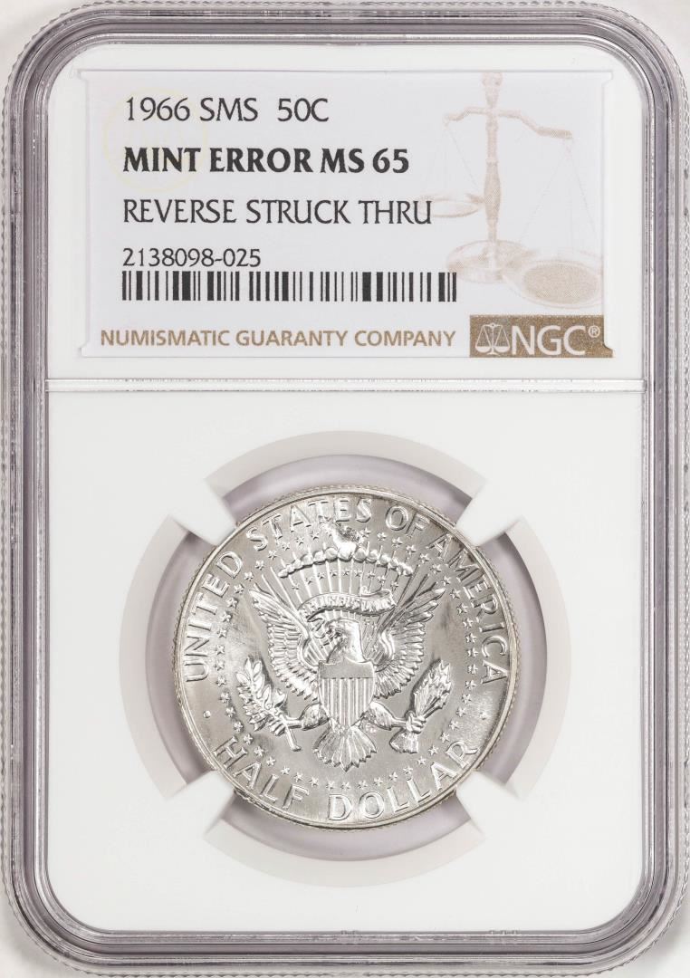 One 1966 SMS Kennedy Half Dollar Coin Reverse Struck Thru NGC Mint Error MS65. NGC Certified.
