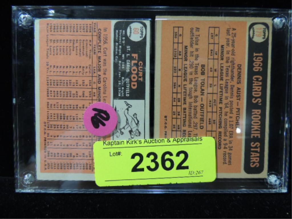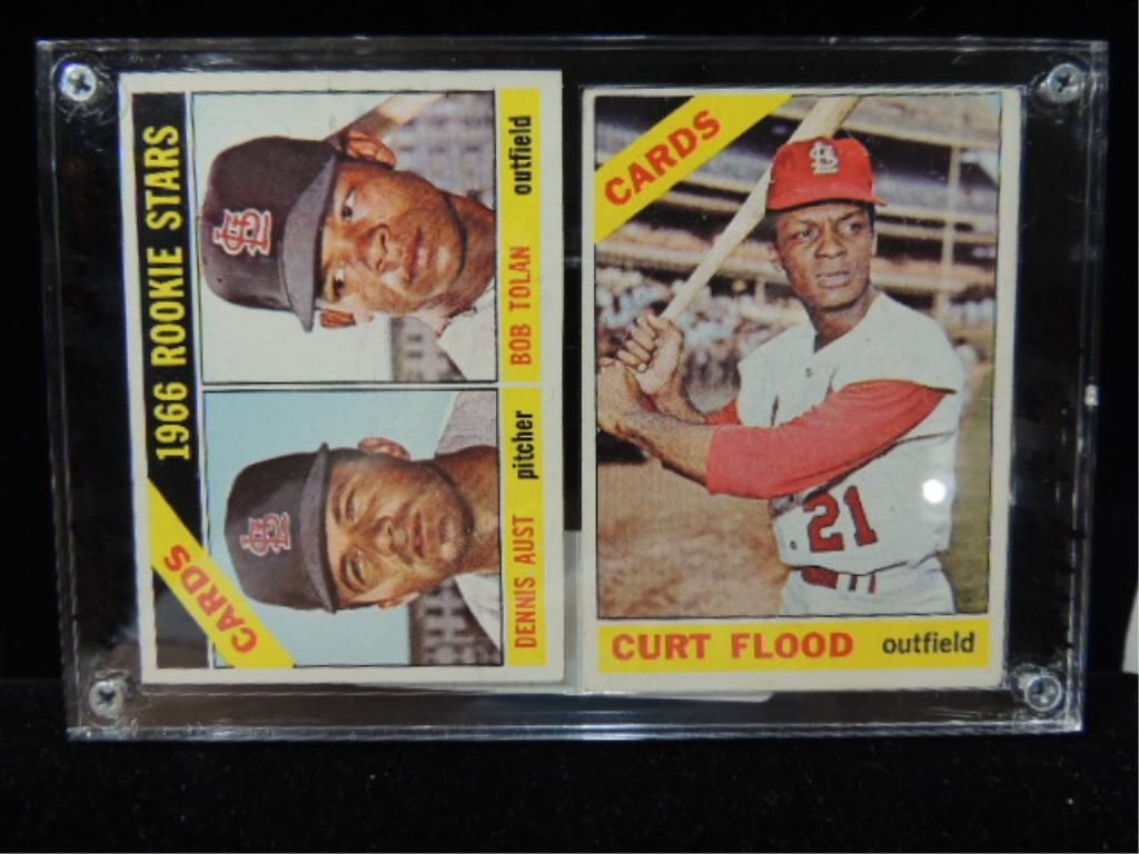 1966 ROOKIE STARS DENNIS AUGT & BOB TOLAN #179 AND CURT FLOOD #60 BASEBALL PLAYER CARDS. BASEBALL TRADING CARDS. VINTAGE CARDS. AS SHOWN. SEE PHOTO FOR MORE DETAILS.