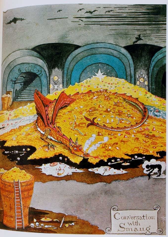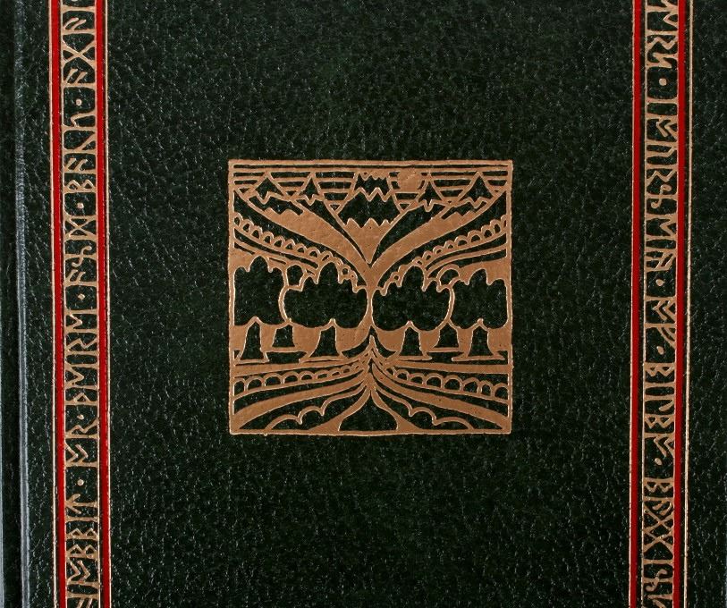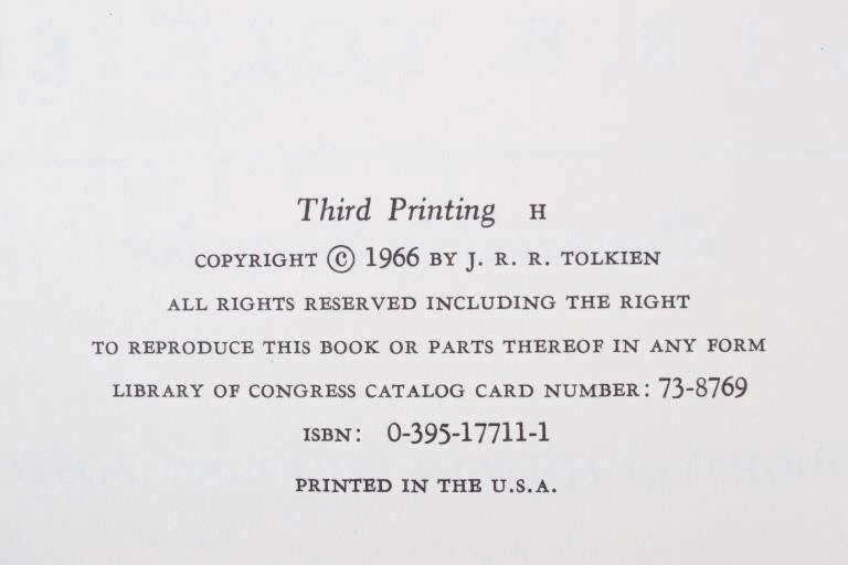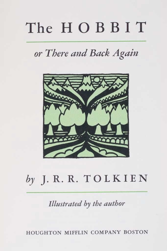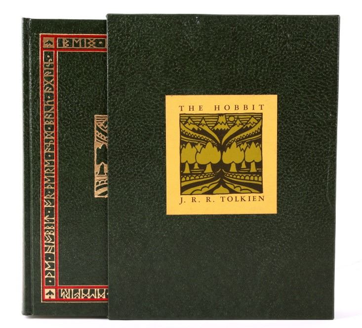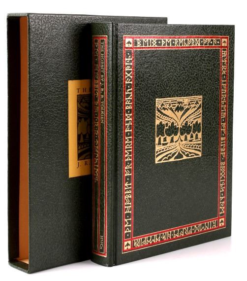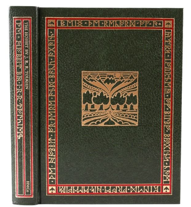 For your consideration is this collector's edition copy of The Hobbit by J.R.R. Tolkien, printed in 1966. This deluxe collector's edition of Tolkien's the Hobbit is boxed and bound in green leather with gold and red foil Norse rune lettering along the spine and cover. The book includes a number of two color illustrations including two pages showing Thror's map. The book is in very very fine condition with little to no signs of use. The book in the case measures 9 1/2" tall by 7" wide by 1 1/2" thick.