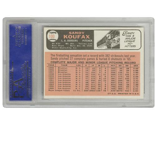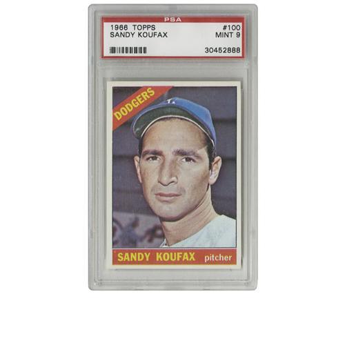 <B>1966 Topps Sandy Koufax #100 PSA Mint 9.</B></I> Adhering to the old adage, "Always leave them wanting more," the great Sandy Koufax bowed out after the season this card was issued, taking a third Cy Young Award with him as he left. Equaling the brilliance of that season is that of this card, one of only sixteen unqualified cards to achieve the mark of Mint 9. None have ever graded higher. A pack-fresh marvel! <BR><BR><B>Important notice:</B> Heritage usually auctions material at the rate of 200-250 lots per hour. On some occasions eBay Live bid software or the Internet may not be able to keep up with the pace of the auction. We recommend placing a realistic absentee bid now as insurance to avoid disappointment. Occasionally the auctioneer may eliminate or reject an eBay Live bid, and the auctioneer may also reopen a lot after the close of the eBay live bidding (usually because we missed an audience bid), and may reject your bid even if it shows you as the winning bidder. By bidding via eBay Live, you agree that Heritage may award the lot to another bidder at its sole discretion under the circumstances described above or any other reasonable circumstances. Since eBay bids are not shown to us until we open the lot on the floor, we treat those bids just like floor bids. In most cases the floor responds before the eBay bid is presented to us, due to Internet lag time, so for consistency we have made it a policy that floor bids are always considered first over tie eBay live bids. Also please note that all Heritage lots purchased through eBay Live carry a 22.5% Buyer's Premium. Please make sure you read the Terms and Conditions before you bid. This lot is being auctioned in conjunction with a live floor auction by Heritage Galleries & Auctioneers. All final auction and invoice information will be supplied by Heritage Galleries & Auctioneers, and all other information should be considered preliminary. Lot:19612 <BR><BR><B>Winning Notification and Billing:</B> After the FINAL session in this auction is complete, Heritage will send e-mail and snail mail invoices. This process normally takes several days. All final auction and invoice information will be supplied by Heritage Galleries & Auctioneers, and all other information should be considered preliminary. <BR><BR>This auction will be conducted on a live auction floor and over the Internet through eBay Live. If you choose to place an absentee bid, please take a moment to <font color='#0000ff'><u><a href='http://pages.ebay.com/liveauctions/help/before/laabsentee.html'>learn how eBay Live absentee bidding works</a></u></font><font color='#000000'>