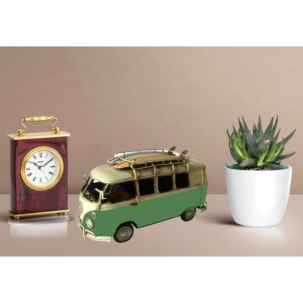 Decorate any table, desk, or shelf in sporty fashion with Our Rustic 1966 Volkswagen Mini Bus Sculpture. Featuring a rustic iron frame, this charming vintage Classic Car includes fine detail. The Green and White Exterior are finished in natural colors. Dimensions: approx (H X W): 6 X 11 Inches.