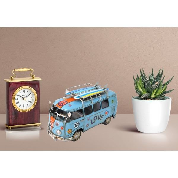 Decorate any table, desk, or shelf in sporty fashion with Our Rustic 1966 Volkswagen Mini Bus Sculpture. Featuring a rustic iron frame, this charming vintage Classic Car includes fine detail. The Blue Exterior is finished in natural colors. Dimensions: approx (H X W): 6 X 10 Inches.