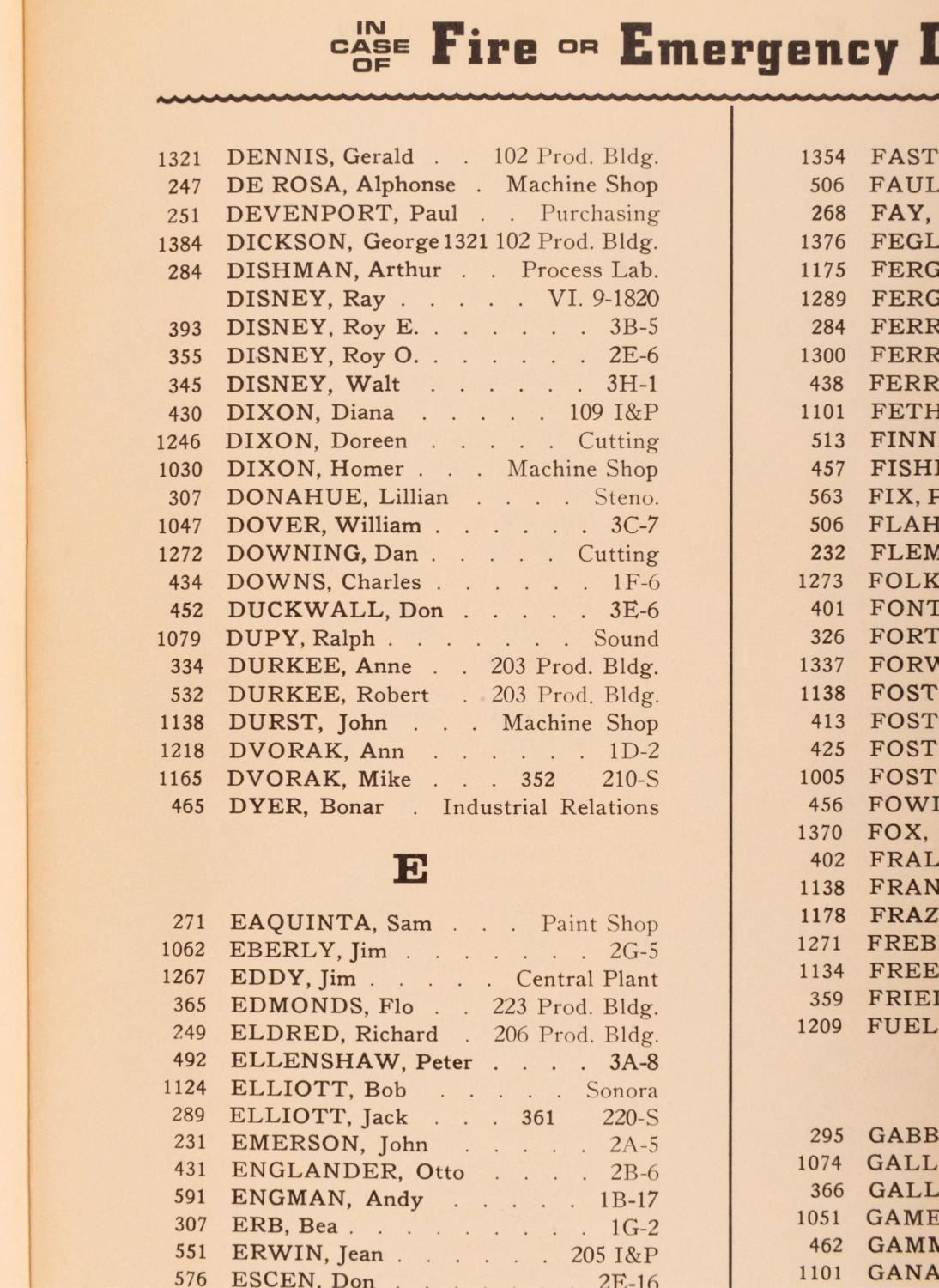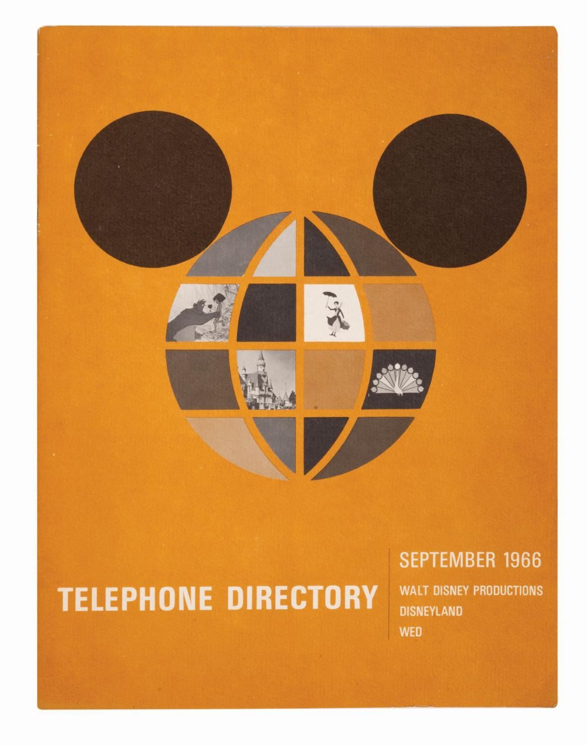 (Disneyland, 1966) A very rare telephone directory for Walt Disney Productions, Disneyland, and WED Imagineering. The 26-page directory lists the departmental staff and includes contact information for notable WED employees such as Marc Davis, Herb Ryman, Rolly Crump, and even Walt Disney himself. The directory measures 11"x8.5" and is in very good condition with minor spine wear and some yellowing to a few pages.