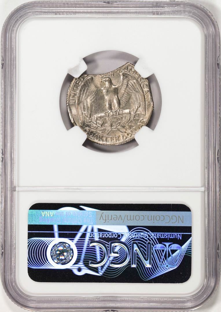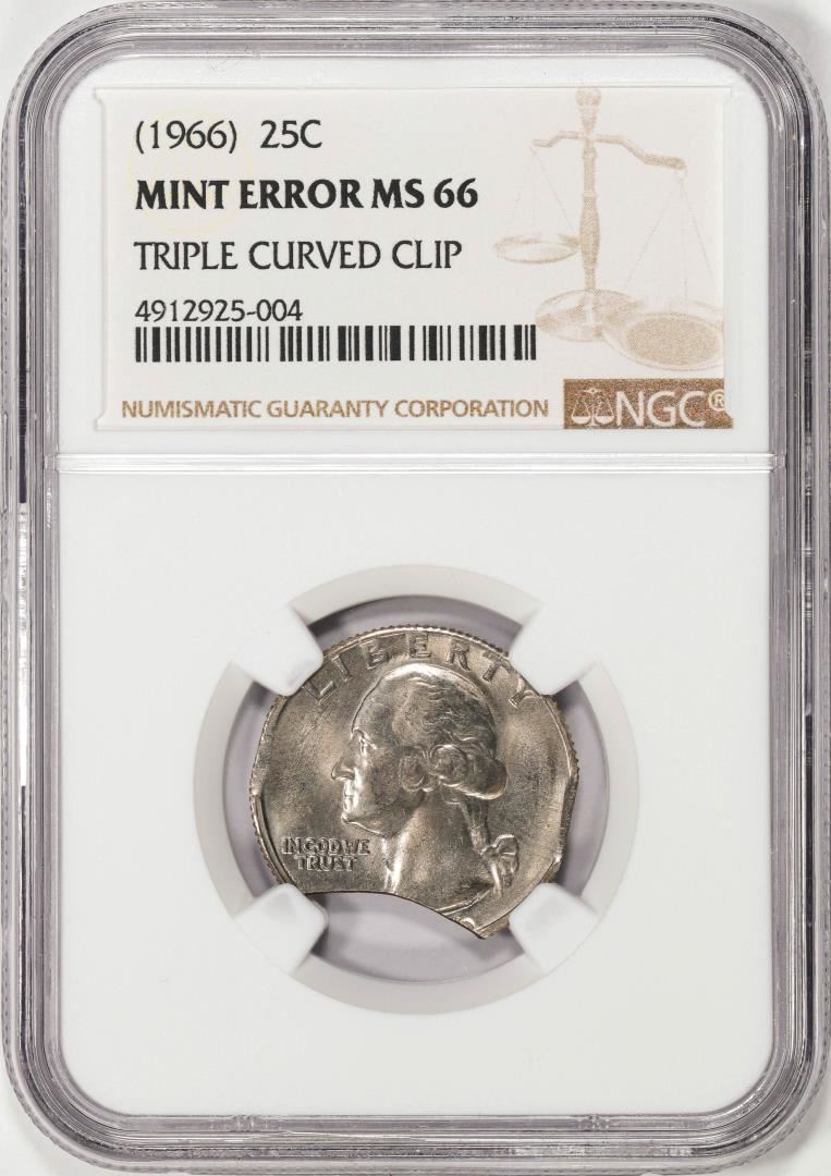 One 1966 Washington Quarter Coin Triple Curved Clip NGC Mint Error MS66. NGC Certified.